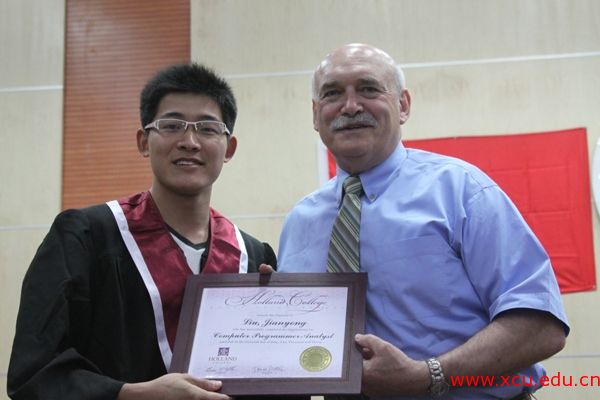 他以一句中文“你好”拉近了与所有人的距离。Brian McMillan校长首先对我方在合作办学方面所作出的努力表示由衷的感谢,同时,他希望对即将走入社会的毕业生们能够活到老、学到老,找到自己的人生目标与追求。仪式上,熊德兰老师代表国际教育学院全体教师发言,送上教师们对毕业生的祝福;毕业生代表翟晓琬代表近400名毕业生感谢母校的培养。典礼上,荷兰学院还向部分品学兼优的学生颁发了荷兰学院2010-2011年度中外合作办学奖学金,我校2008级学生翟晓琬、魏赛新,2009级学生吴兵、李论获此殊荣。仪式最后,许昌学院院长陈建国与荷兰学院院长Brian McMillan一起为2011届300多名中外合作办学毕业生颁发了毕业证,并与毕业生们一一合影留念。(图片由国际教育学院提供)