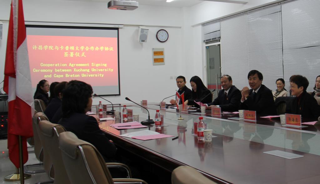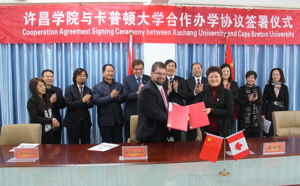 党委书记陈建国代表许昌学院致辞,表示卡普顿大学,作为加拿大一所知名高校,和中国教育界有着广泛的合作关系,在我校的发展过程中,能够与该校成为合作伙伴,感到十分荣幸,同时也衷心的希望许昌学院和卡普顿大学进一步加强联系,扩大交流,增进了解,精诚合作,共谋双赢。随后,院长赵继红、卡普顿大学校长戴尔· 基夫博士代表双方学校就“财务管理”、“人力资源”、“化学工程与工艺”专业签署了合作办学协议。该协议的签订为我校申报2017年教育部中外合作办学项目迈出了坚实的一步,更为我校切实引进优质教育资源,加速我校相应学科的专业改造,深化我校“国际化”办学理念打下了坚实的基础。